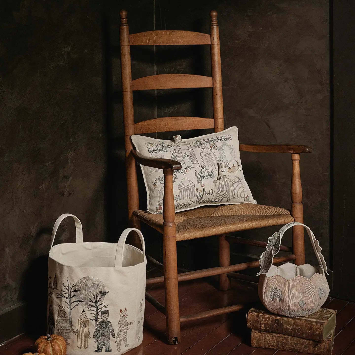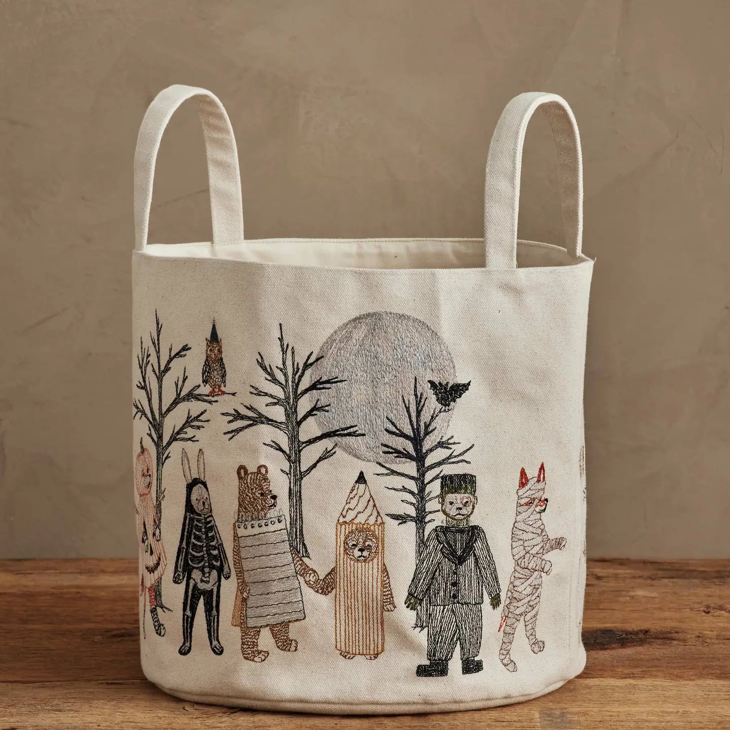 Details: A festive Halloween-themed canvas bucket embroidered on all sides with whimsical animal characters in costume. Features include foxes as a Jack-o’-lantern and mummy, rabbits as a skeleton and ghost, bear brothers as a pencil and notepad, a Frankenstein dog, and a wizard owl under a full moon. Includes two side handles and an interior pocket.