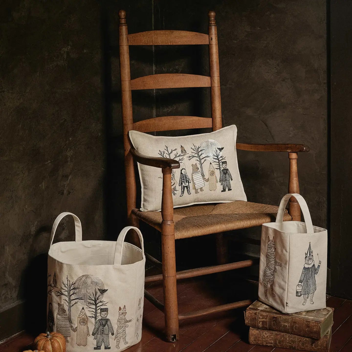 Details: A Halloween-themed linen pillow featuring embroidered woodland animals in costume under a full moon. Includes Fox as a Jack-o’-lantern, Bunny in a skeleton suit, Bear brothers as a pencil and notepad, Dog as Frankenstein, and an Owl in a wizard hat with a silver wand, all gathered under moonlit trees.